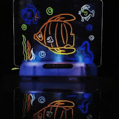Enciende la pizarra con el botón y mira cómo tus dibujos cobran vida con luz mágica.